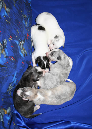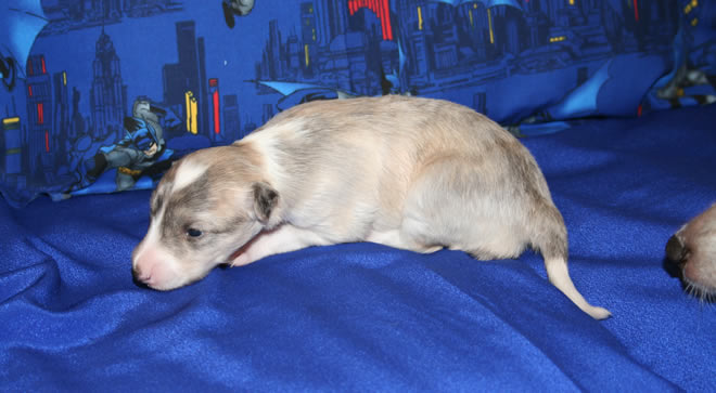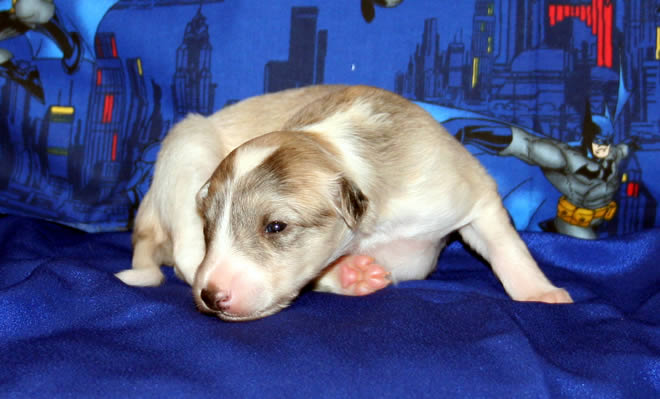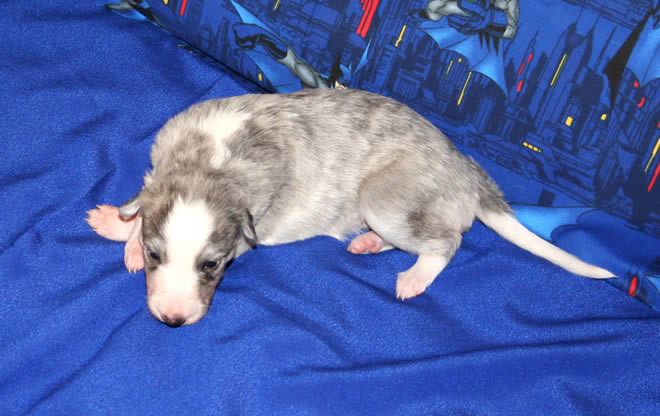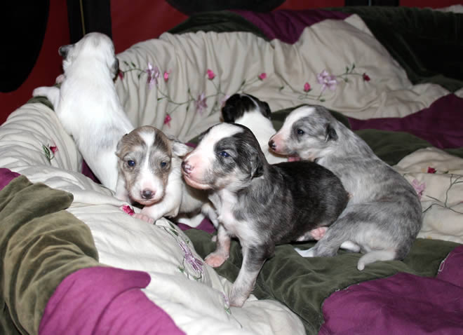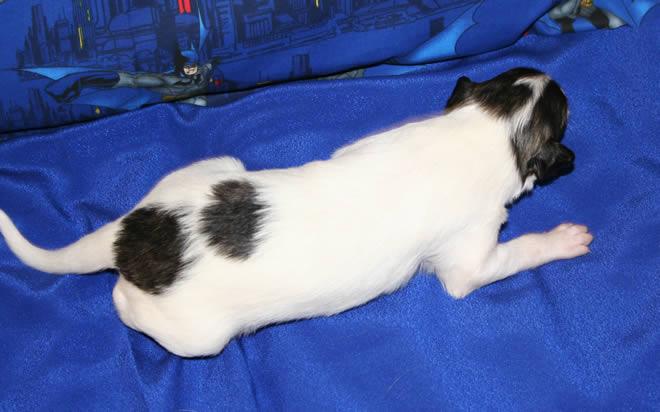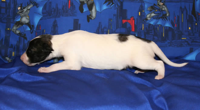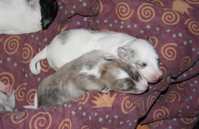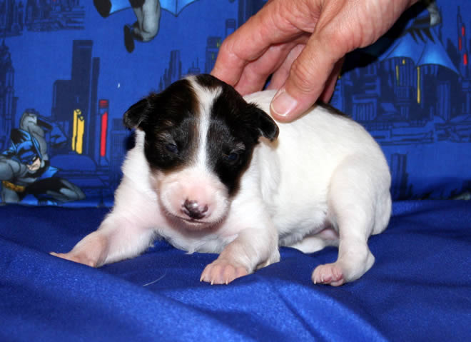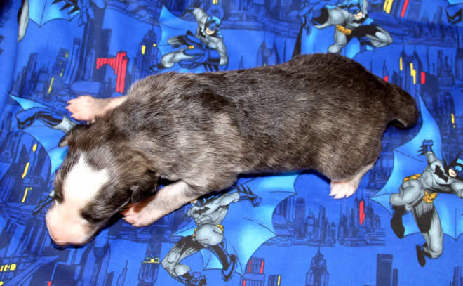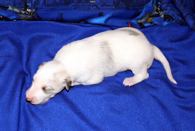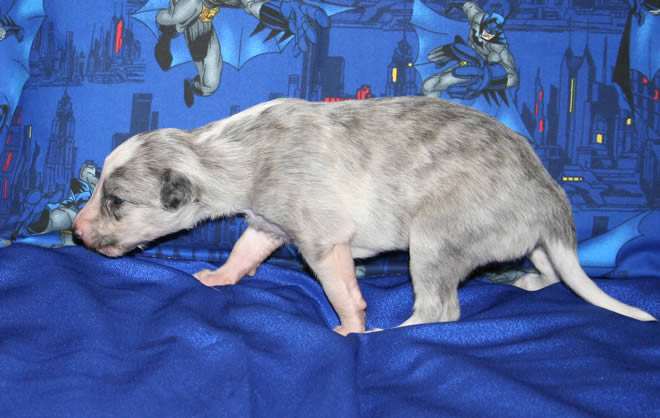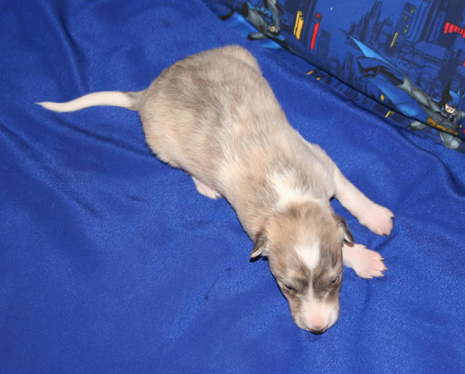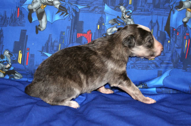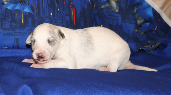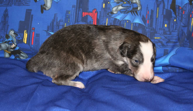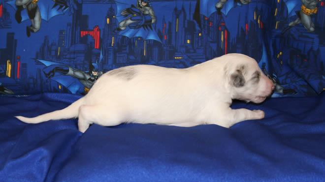 At two weeks old, the babies eyes are starting to open so they can see the world. It is amazing how fast they are growing and how expressive they are at this young age! They are starting to develop pigment and colors are becoming more identifiable. While it is a little early yet, all of the puppies seem to recognize family members and want to explore.