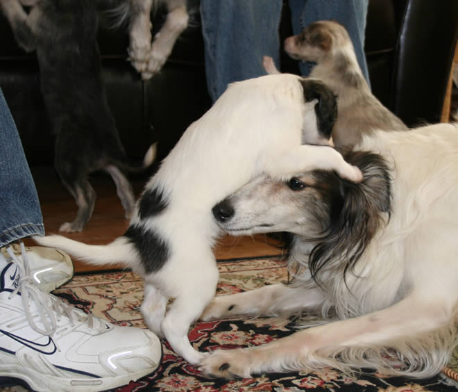 Milkbar? Isis uncertain whether she can provide puppies with what they are looking for...